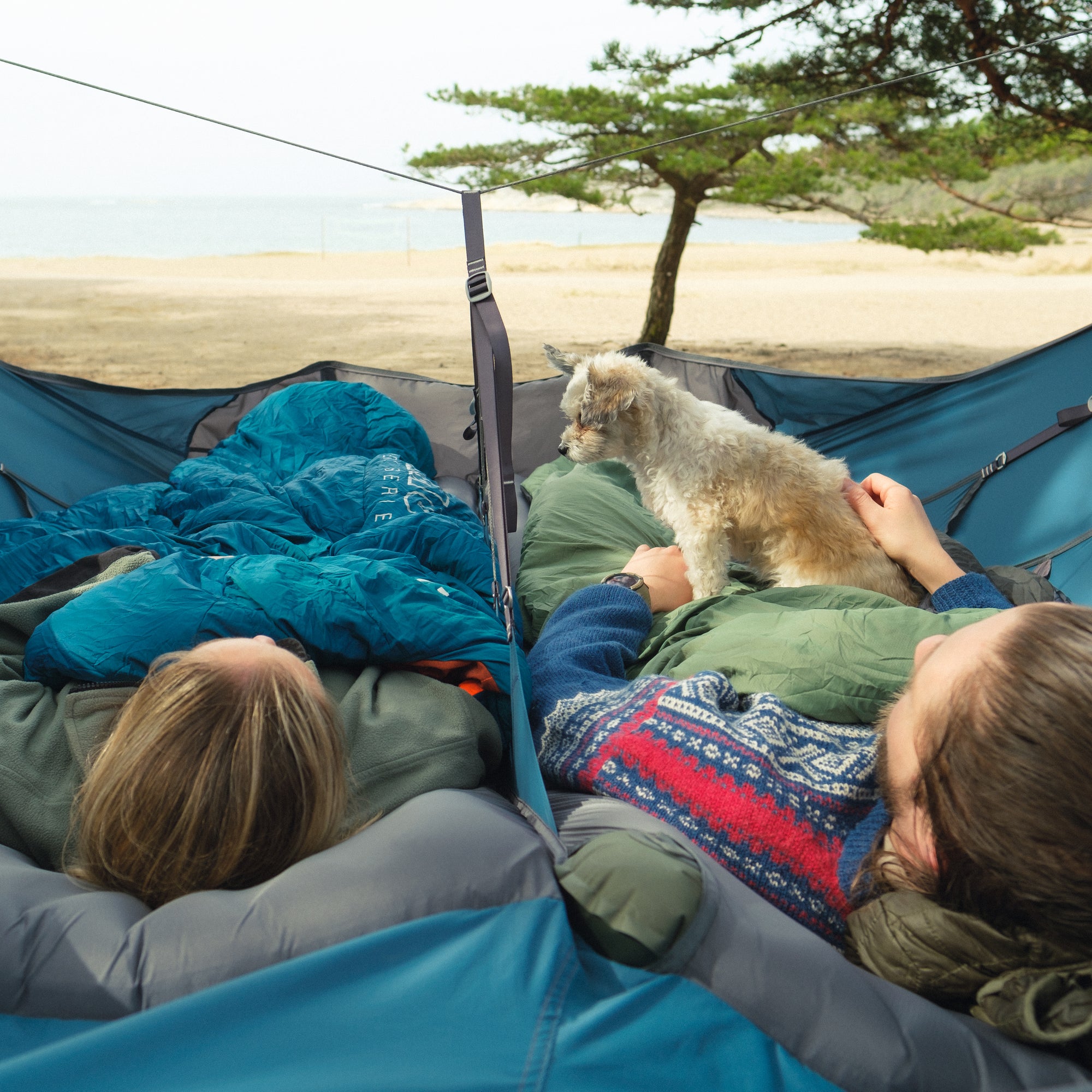 The Amok Draumr Double hammock is designed to be used together with inflatable sleeping pads for ultimate comfort and insulation. Together with the hammock structure, the inflatable pads gives the Draumr Double hammock its unique flat lay. You don't need an underquilt in the Draumr Double as the the pad insulates from below and keeps you warm. Inside the hammock there are pockets that hold your sleeping pads in place.
